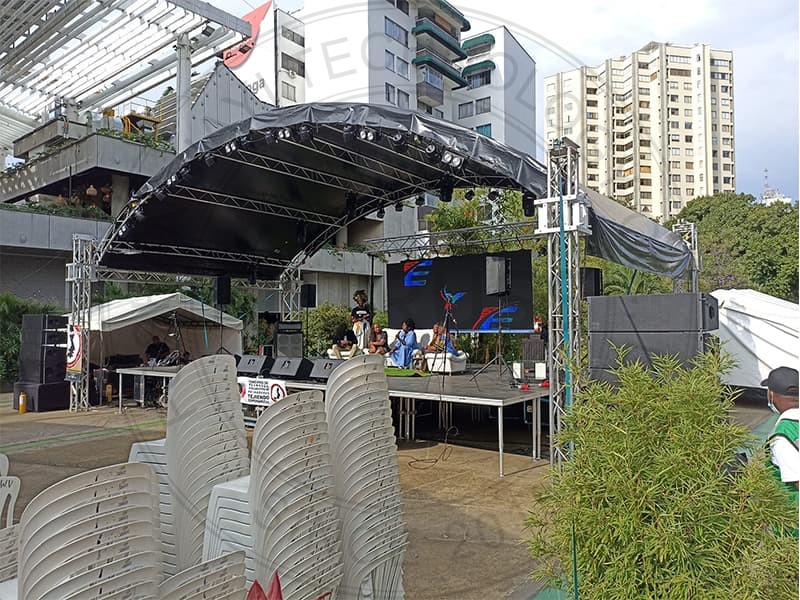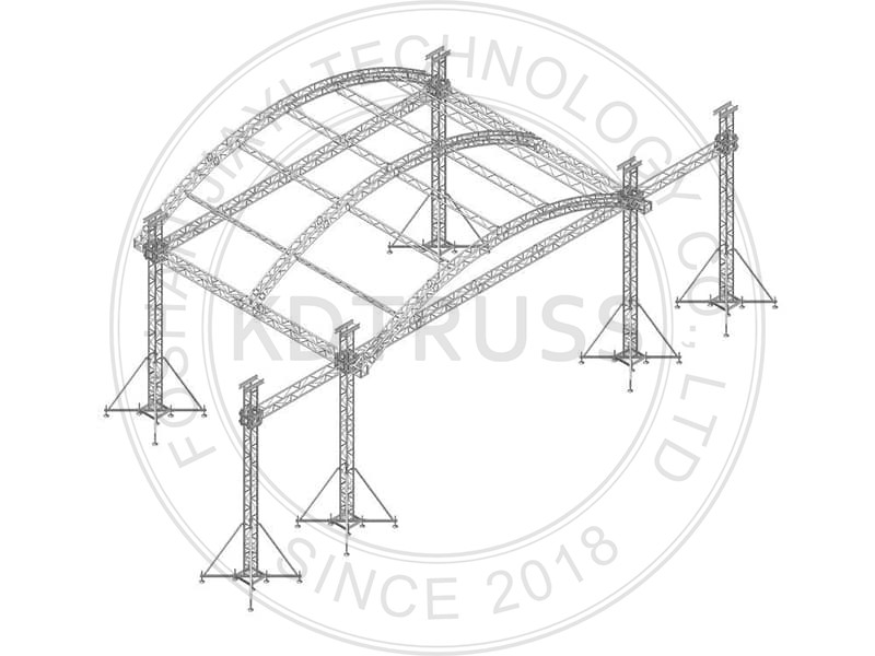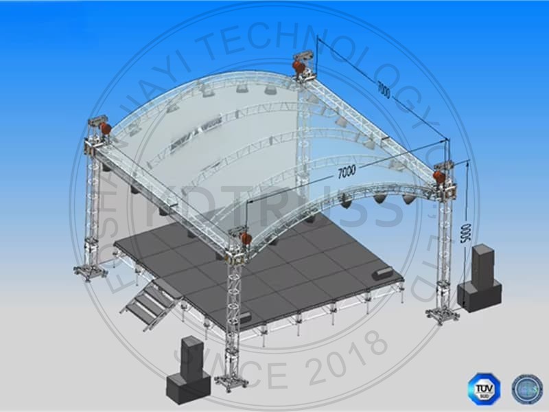 A: The Truss Design can make 10*8*7m/ 12*10*7m/ 12*8*7m and Max. 16*16*7m two integrated 2m-wide speaker wings specially designed for line array speakers.